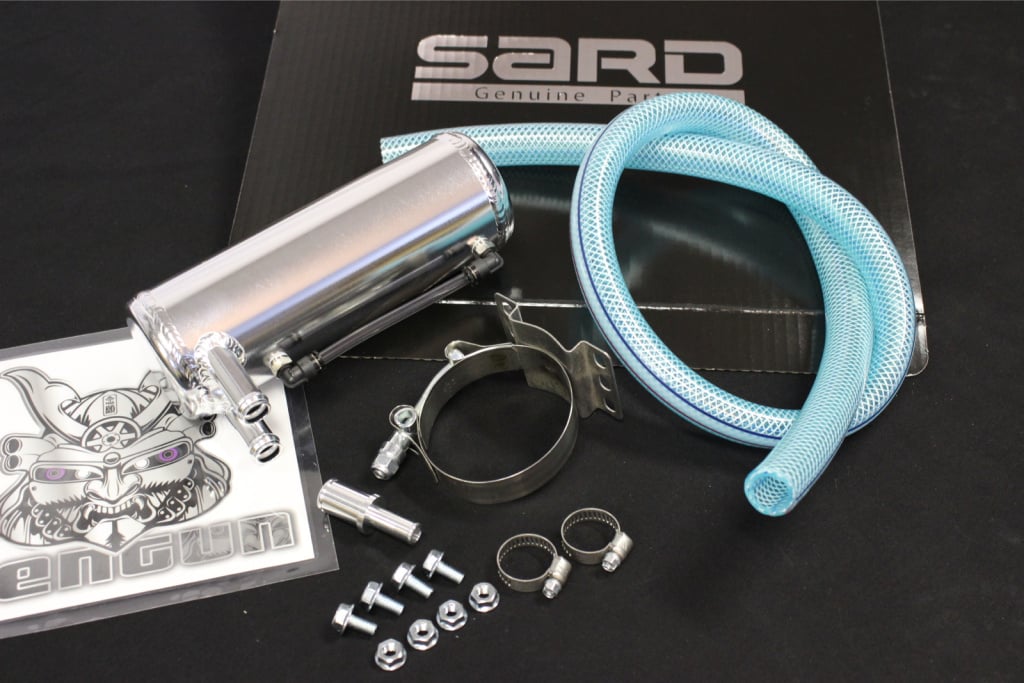 An oil catch tank works & functions like a crankcase vent filter. In most vehicles, the vented gas & oil are recycled back into the vehicle air intake piping just before the throttle body. An oil catch tank will bypass the connection between the crankcase & air induction intake piping. This will help in relieving the pressure placed against the valve train under severe engine loads. The SARD tank will catch or collect excess engine oil that is vented out by the valve train. This will ensure a clean engine compartment and maintain the custom look of the engine, and at the same time, maximizes engine performance. The SARD Oil Catch Tank are made of all stainless steel construction. With a built-in oil level gauge, a driver can check the quantity of oil collected in the tank. Secure installation is made possible by using a T-bolt crank fastener.
